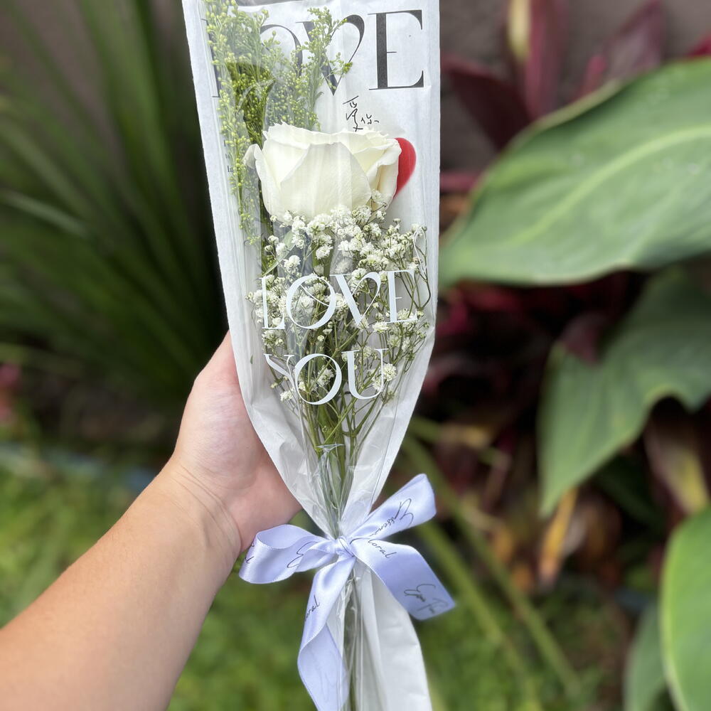 Este buquê é composto por uma única rosa vermelha encantadora, apresentada com folhagens elegantes. Embalado em uma requintada embalagem decorada e arrematada com um laço, é o presente perfeito para expressar seus sentimentos mais profundos. O charme simples, mas clássico desta peça la torna uma escolha perfeita para qualquer ocasião.