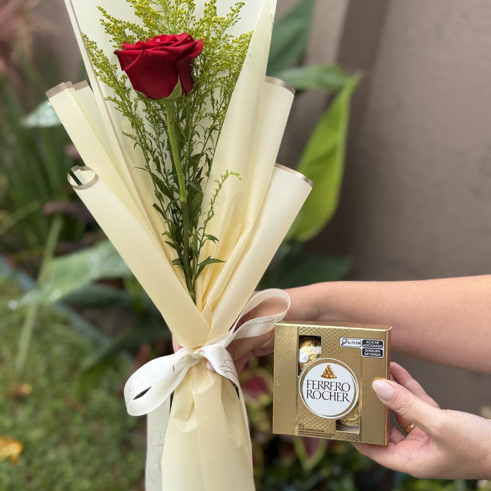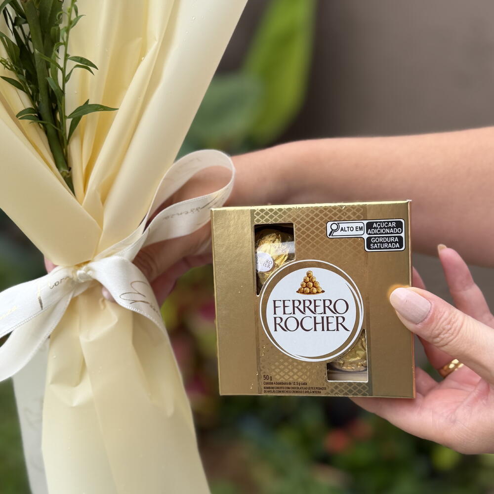 laço - 1 un. ferrero rocher 4 un - 1 un. embalagem especial que valoriza a beleza das flores - 1 un. rosa de ir - 1 un.