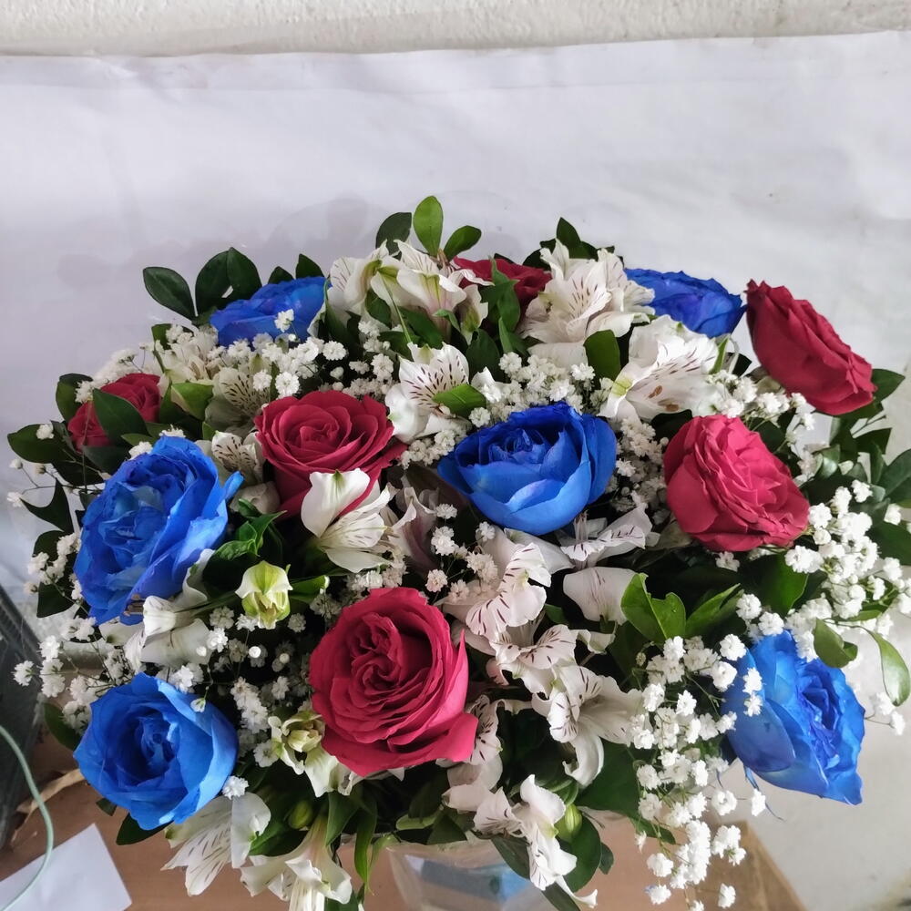 celofane - 1 un. rosa coloridas - 12 un. laço - 1 un. astromelias - 1 un. mosquitinhos - 1 un.