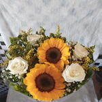 Experimente a beleza e o encanto deste buquê artesanal, composto por rosas brancas elegantes, símbolo de amor puro e ingênuo, combinadas com girassóis vibrantes que irradiam alegria e energia positiva. As flores são cuidadosamente envoltas em celofane para preservar sua frescura e finalizadas com um laço elegante, que acrescenta um toque de sofisticação. Perfeito para expressar sentimentos profundos, celebrar momentos especiais ou simplesmente iluminar o dia de alguém com carinho.