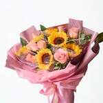 Este lindo ramalhete é uma celebração de cores vibrantes e alegria. Com seis girassóis radiantes e seis rosas encantadoras, este buquê é um verdadeiro espetáculo floral. Os complementos cuidadosamente escolhidos adicionam um toque especial, enquanto a decoração com luz de fada e tela cria uma atmosfera mágica. Envolto em uma embalagem elegante em tons de rosé e dourado, este ramalhete é mais do que um presente floral, é uma experiência encantadora e iluminada que certamente iluminará o dia de quem o receber.