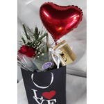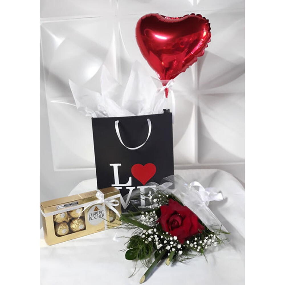 Trate alguém especial com esta bela sacola personalizada cheia de surpresas maravilhosas! No interior, você encontrará uma elegante rosa em um delicado arranjo, perfeita para expressar o seu carinho. Acompanha um balão metalizado que adiciona um toque de diversão e celebração ao presente. E, é claro, o destaque é uma caixa de deliciosos Ferrero Rocher, contendo 8 unidades de sabores irresistíveis. Este presente com chocolate é a combinação perfeita de elegância e sabor que certamente irá encantar e surpreender quem o receba.