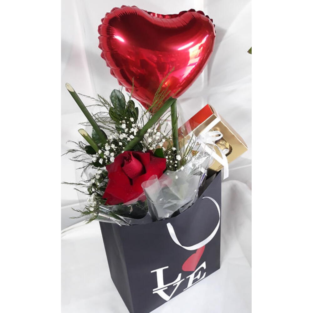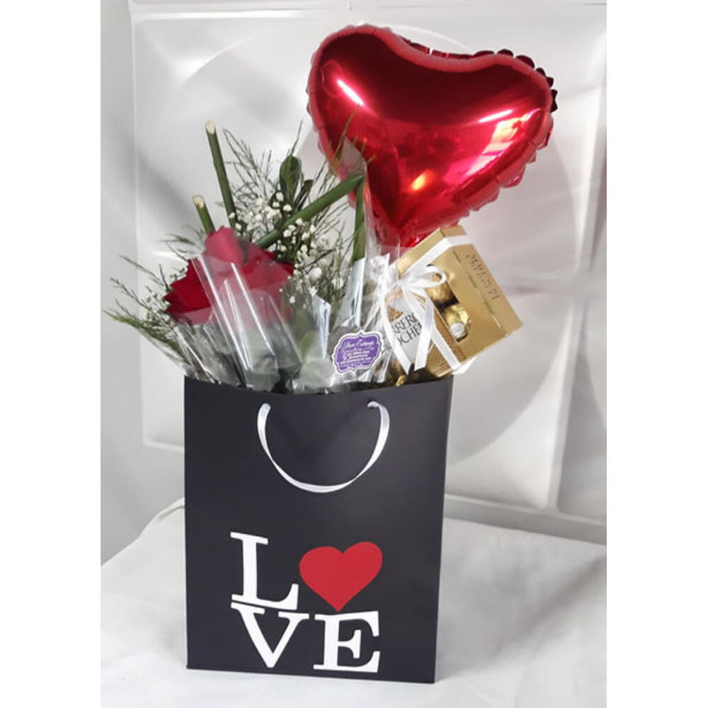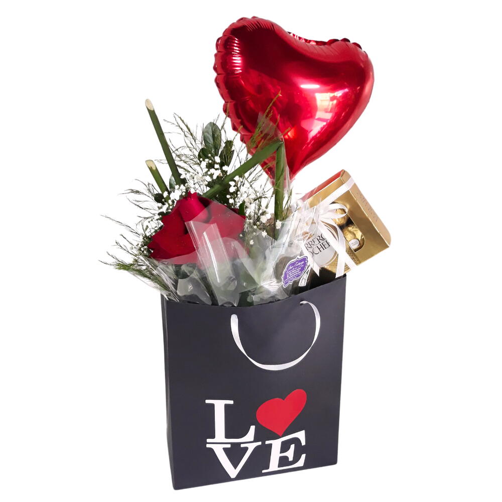 uma sacola personalizada - 1 un. um arranjo de flores naturais - 1 un. uma caixa de ferrero rocher com 8 unidades e um balão de coração metalizado 9 - 1 un.