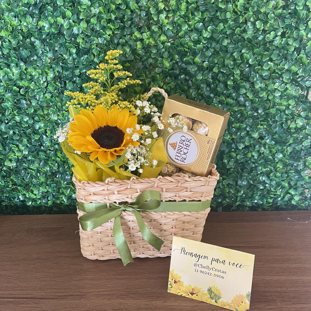Este presente com chocolate é o mimo perfeito para alegrar o dia de alguém. Ele contém um girassol vibrante e alegre, complementado por uma variedade de folhagens para adicionar um toque de natureza. Tudo é lindamente embalado em uma elegante embalagem para presente e vem com uma charmosa sacolinha de palha para um toque rústico. Um presente caloroso e aconchegante que certamente será apreciado.