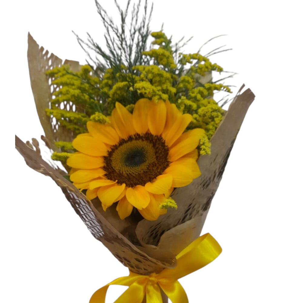 folhagens - 1 un. girassol - 1 un. tango e folhagem - 1 un. laço em cetim - 1 un. embalagem karft - 1 un.