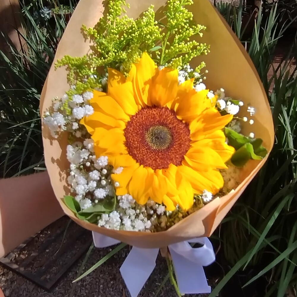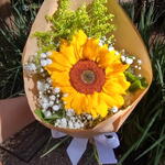 Este encantador buquê apresenta um solitário e vibrante girassol, harmoniosamente complementado por uma folhagem verdejante. Tudo é cuidadosamente envolvido em uma embalagem de papel Kraft e finalizado com um elegante laço de cetim. Um presente solar e alegre para iluminar o dia de alguém.
