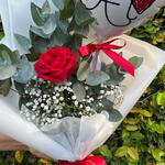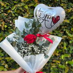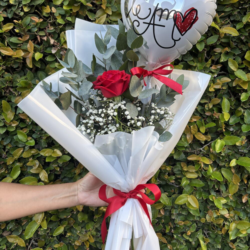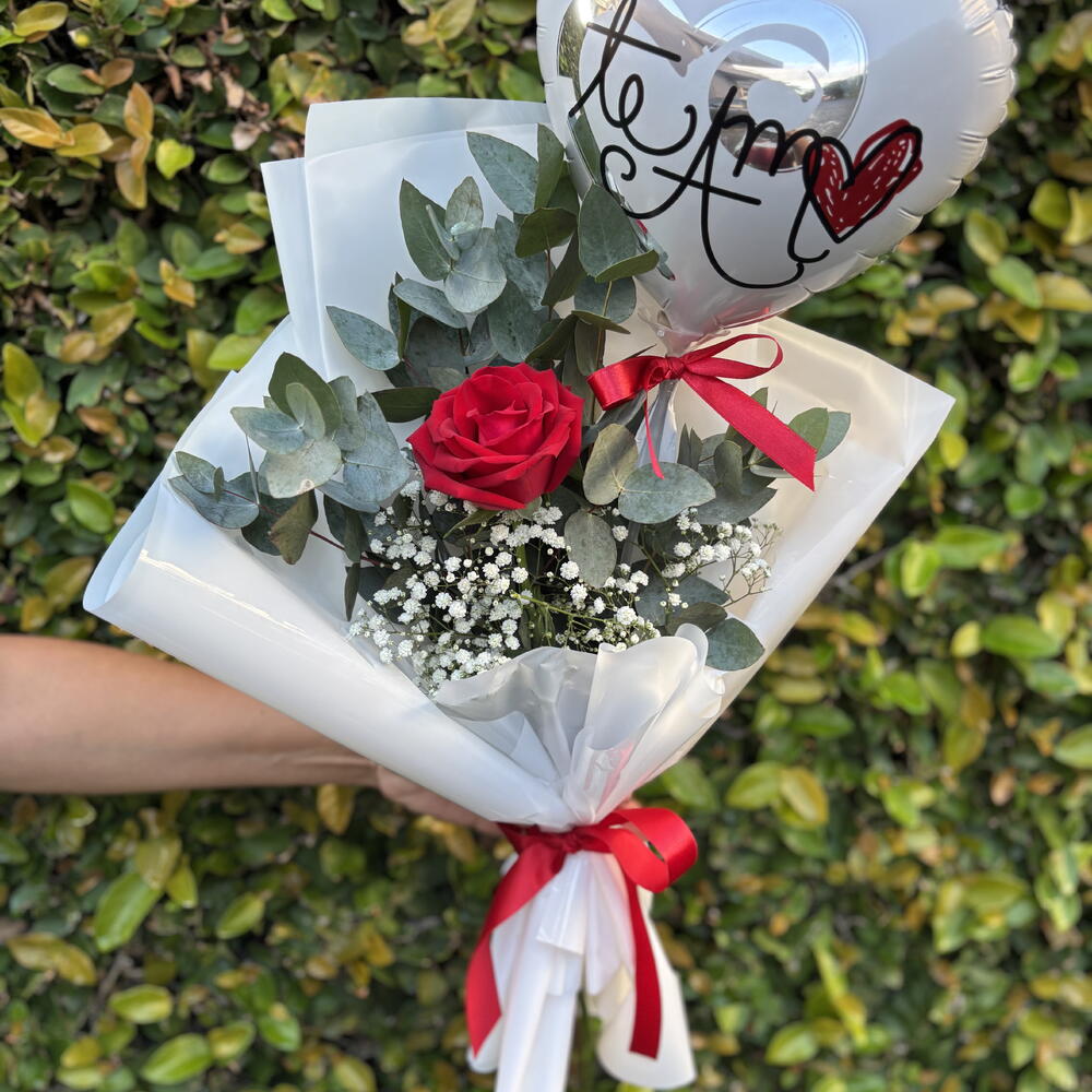 Apresentando um exclusivo e elegante buquê perfeitamente adequado para expressar seus sentimentos mais íntimos. Este buquê inclui um balão Te amo, que voa alto com o seu amor, assim como três unidades de refrescante folhagem de eucalipto cuidadosamente selecionadas para trazer uma sensação de natureza e frescor. Além disso, o buquê contém uma impressionante rosa colombiana de cabo longo, conhecida por seu tamanho e beleza, captando a essência do amor e do romance de uma maneira única. Finalmente, todo o conjunto é habilmente embalado em uma conveniente embalagem para presente, dando um toque final de elegância, e é graciosamente amarrado com um laço em cetim para dar um luxuoso destaque. Este buquê é um gesto eloquente do seu amor, criando uma lembrança memorável.
