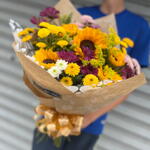 folhagens - 1 un. laço - 1 un. girassois - 5 un. mix de flores complementares - 1 un. embalagem karft e transparente - 1 un.