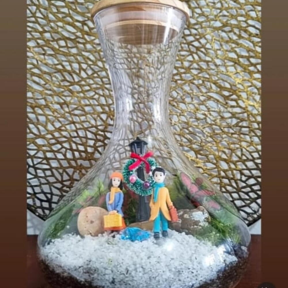 Um terrário encantador que retrata um casal em meio a uma paisagem nevada, trazendo sensação de aconchego e magia invernal. Com detalhes cuidadosamente montados, ele é perfeito para decorar, presentear ou adicionar um toque romântico e festivo ao ambiente. Uma peça charmosa que transmite ternura e tranquilidade.