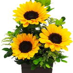 Este encantador arranjo de flores é composto por 3 girassóis radiantes, capazes de trazer um toque de alegria e natureza para qualquer ambiente. Acompanhando as poderosas flores, estão 3 unidades de folhagens e complementos, cuidadosamente escolhidos para criar uma composição harmoniosa e atraente. Para completar, o arranjo é habilmente acondicionado em um charmoso cachepot de madeira, oferecendo um estilo rústico e elegante. Este arranjo floral é ideal para decorar a sua casa ou como um pensativo presente para alguém especial.