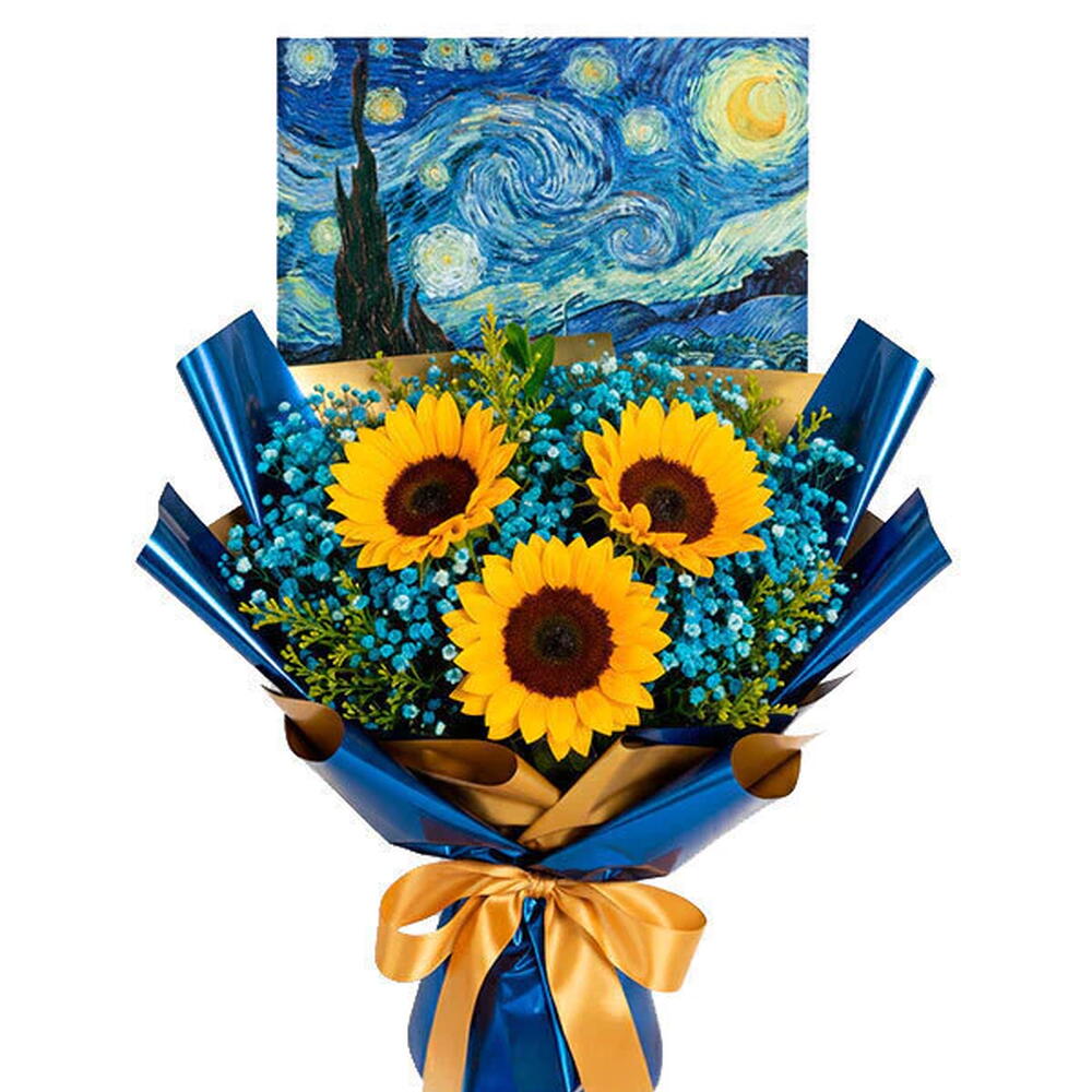 girassol - 3 un. laço em cetim - 1 un. embalagem moderna - 1 un. desenho van gogh - 1 un.