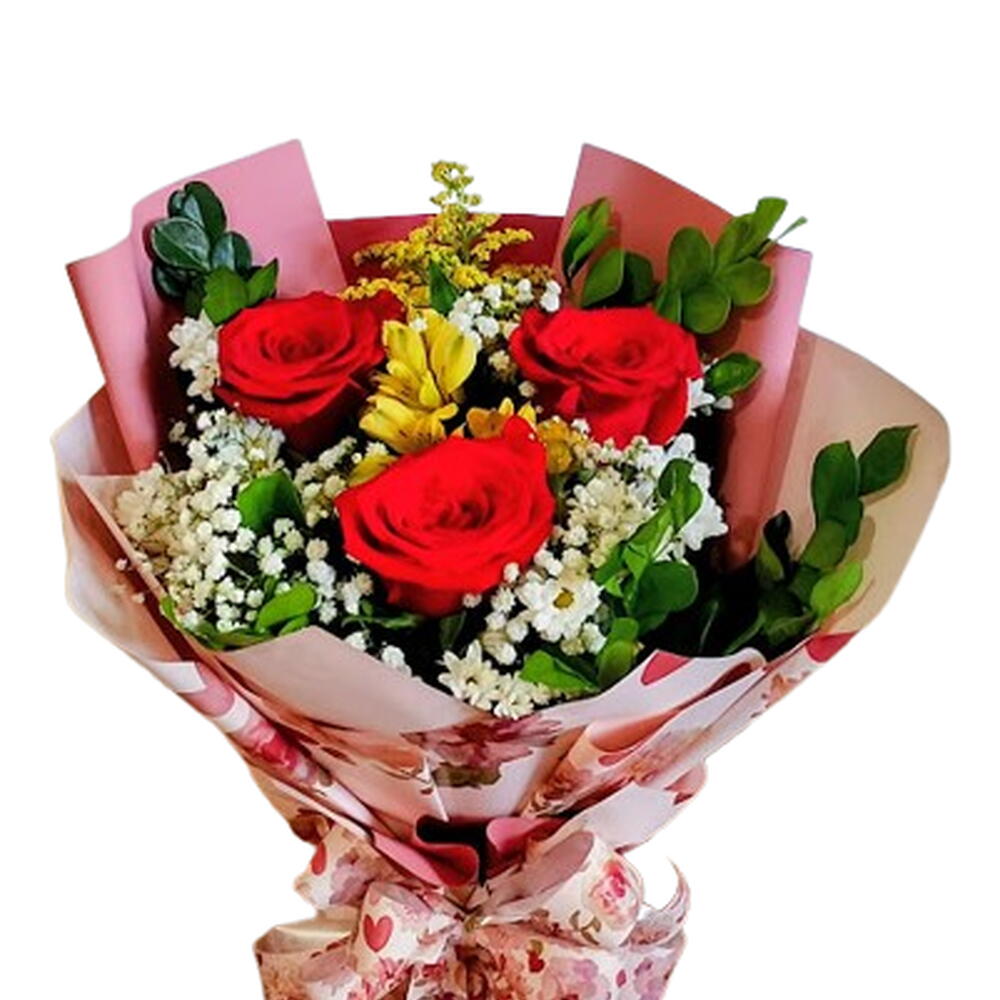 Um arranjo delicado e apaixonante com 3 rosas vermelhas, flores complementares em tons suaves e folhagens verdes que realçam toda a sua beleza. Perfeito para surpreender em momentos especiais, declarar amor, carinho e admiração com muito charme e elegância. Uma escolha encantadora para presentear e tornar qualquer ocasião inesquecível.