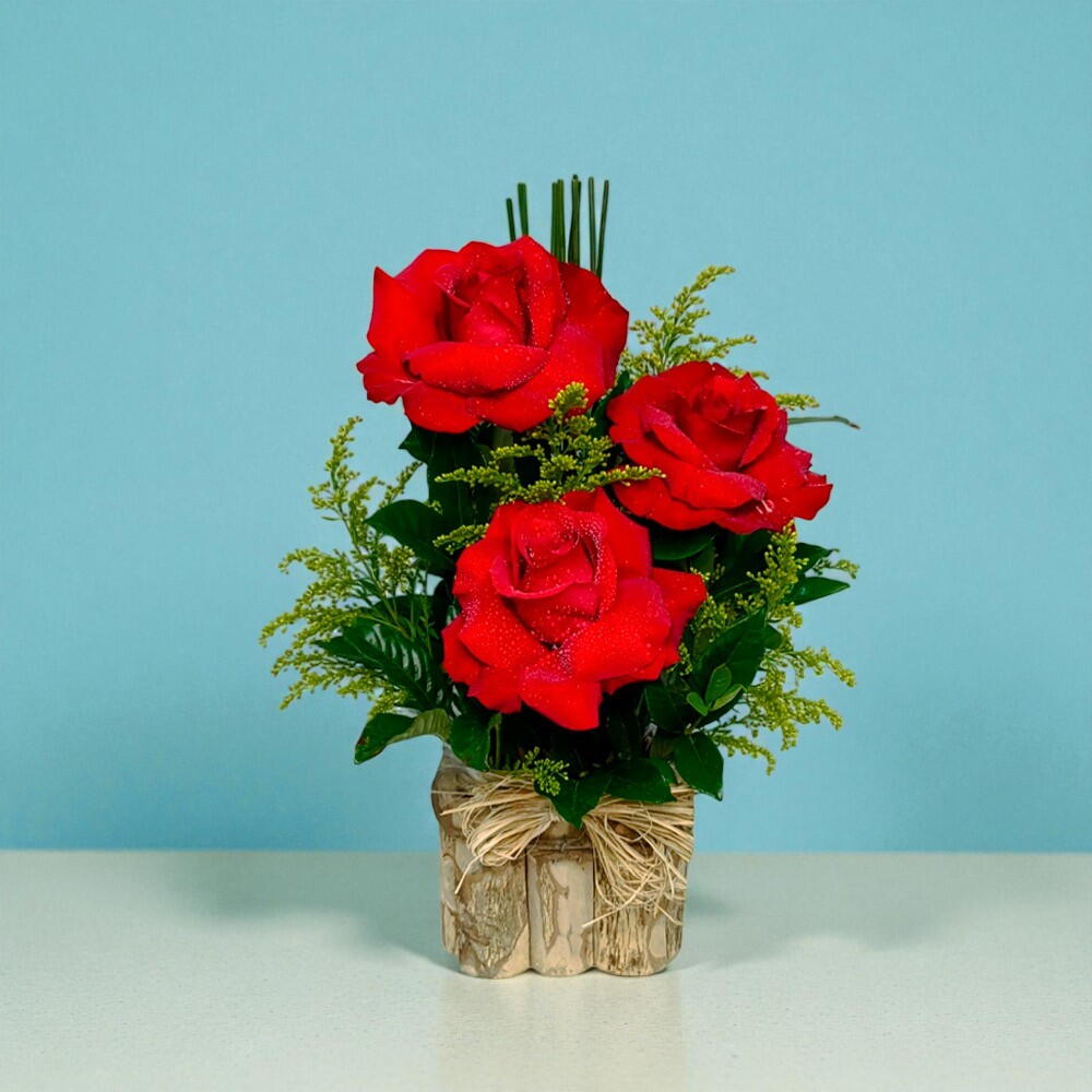 Este buquê da categoria Buquês é cuidadosamente composto por três magníficas rosas, elegantemente realçadas por uma unidade de folhagens. Esta composição floral é habilmente acondicionada e entregue numa caixa especial, adicionando um toque de sofisticação e elegância. É a expressão perfeita do amor e do apreço, ideal para surpreender alguém especial ou simplesmente para embelezar o seu espaço!