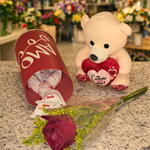 rosa vermelha - 1 un. urso de pelúcia - 1 un. bombons raffaello - 11 un. tubo amo você - 1 un.