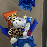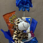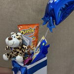 balão metalizado personalizado - 1 un. cachepot decorado - 1 un. bombom sortido - 1 un. salgadinho cheetos - 1 un. barra de chocolate 75g - 1 un. pelúcia buba - 1 un.