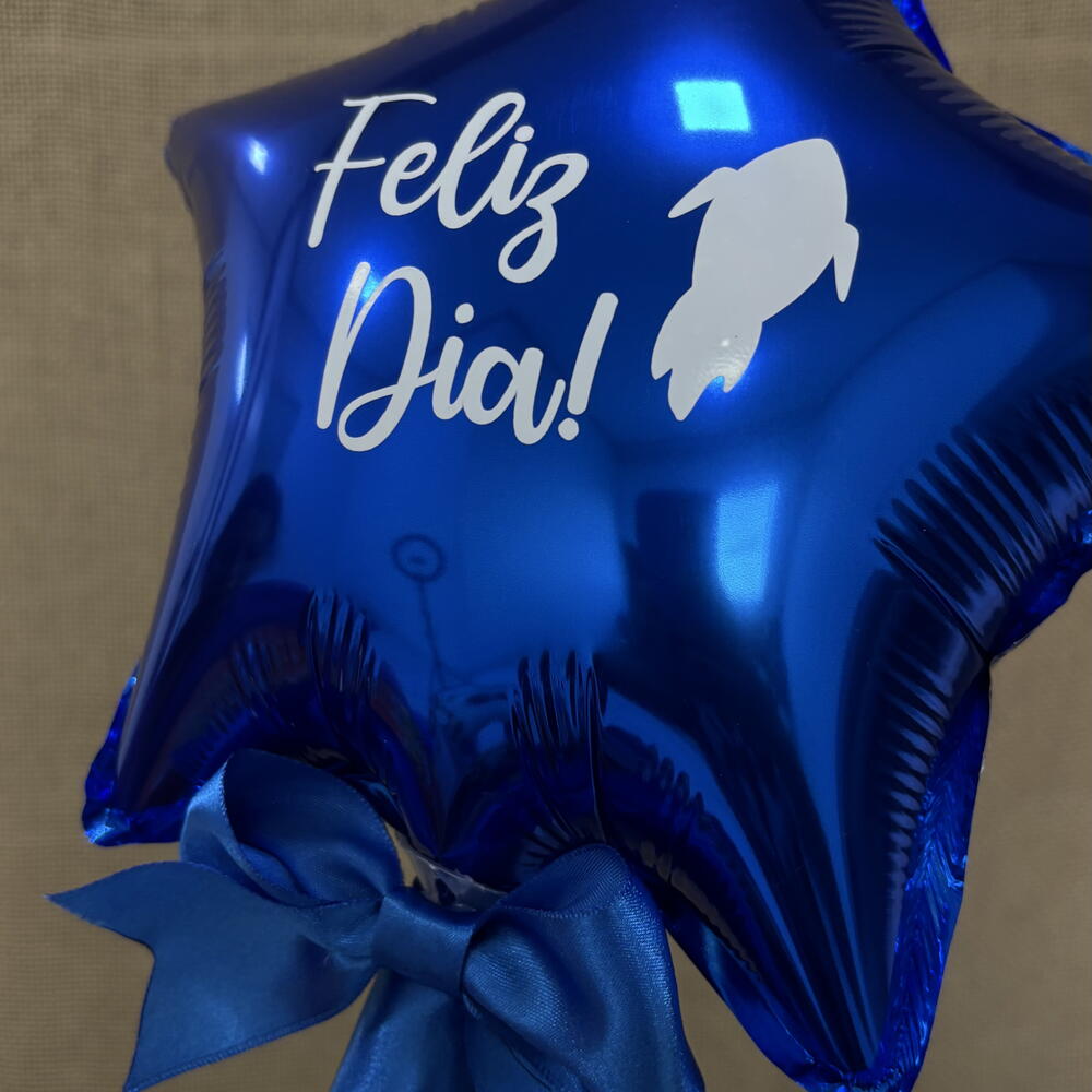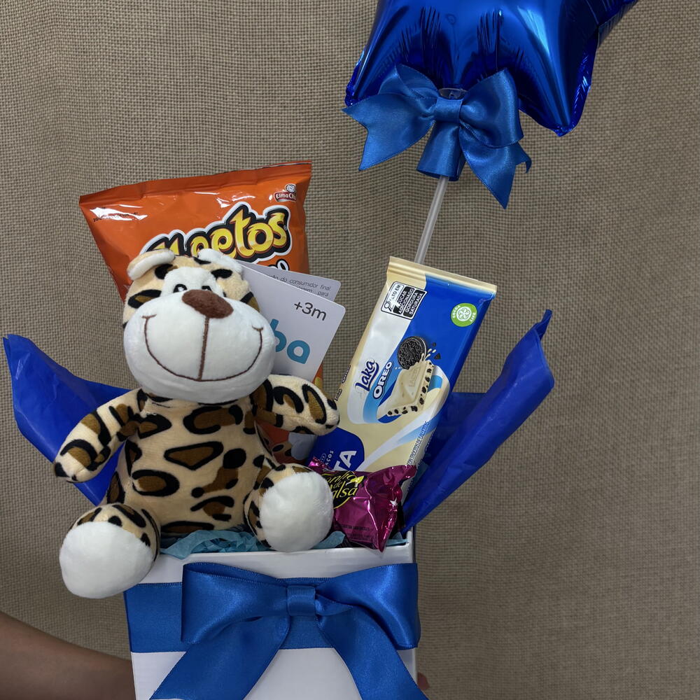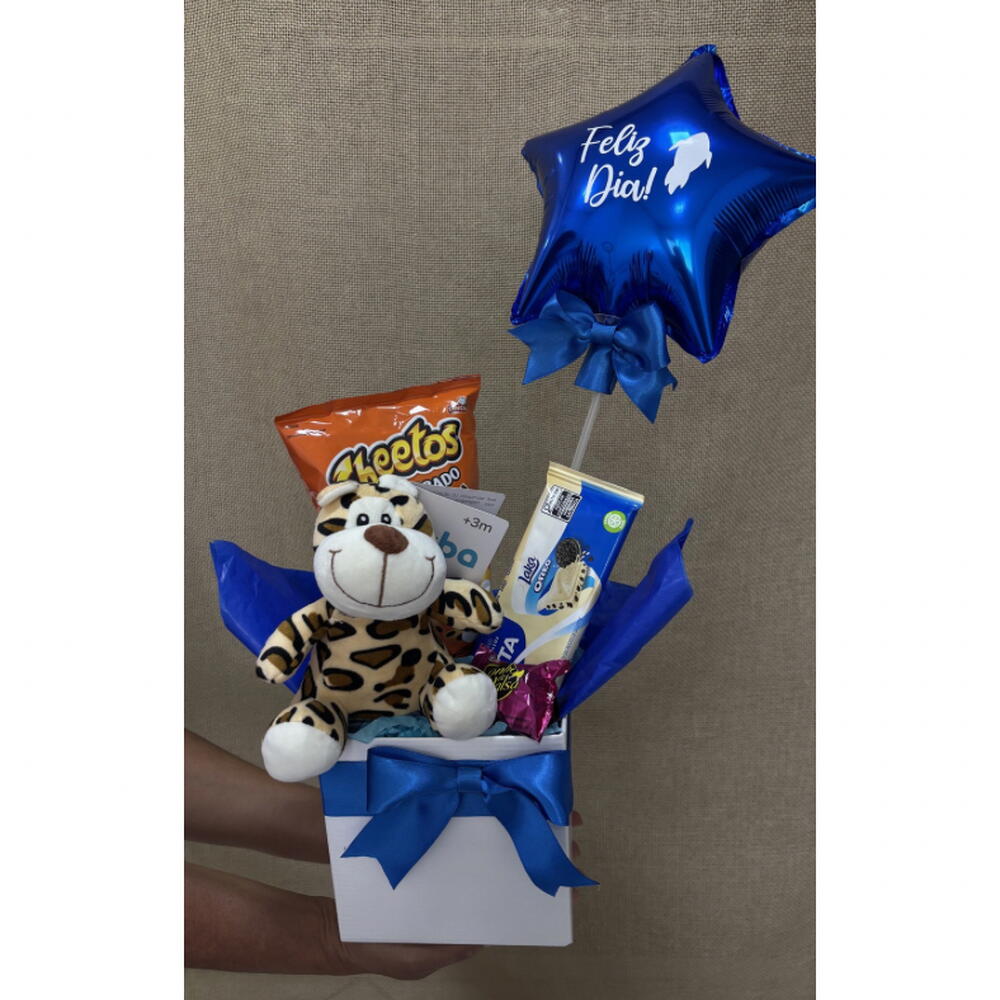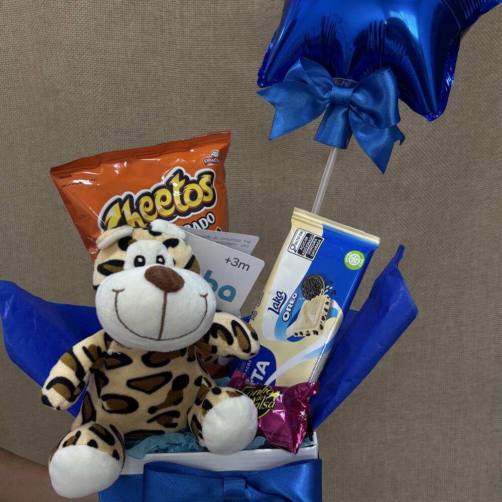 balão metalizado personalizado - 1 un. cachepot decorado - 1 un. bombom sortido - 1 un. salgadinho cheetos - 1 un. barra de chocolate 75g - 1 un. pelúcia buba - 1 un.