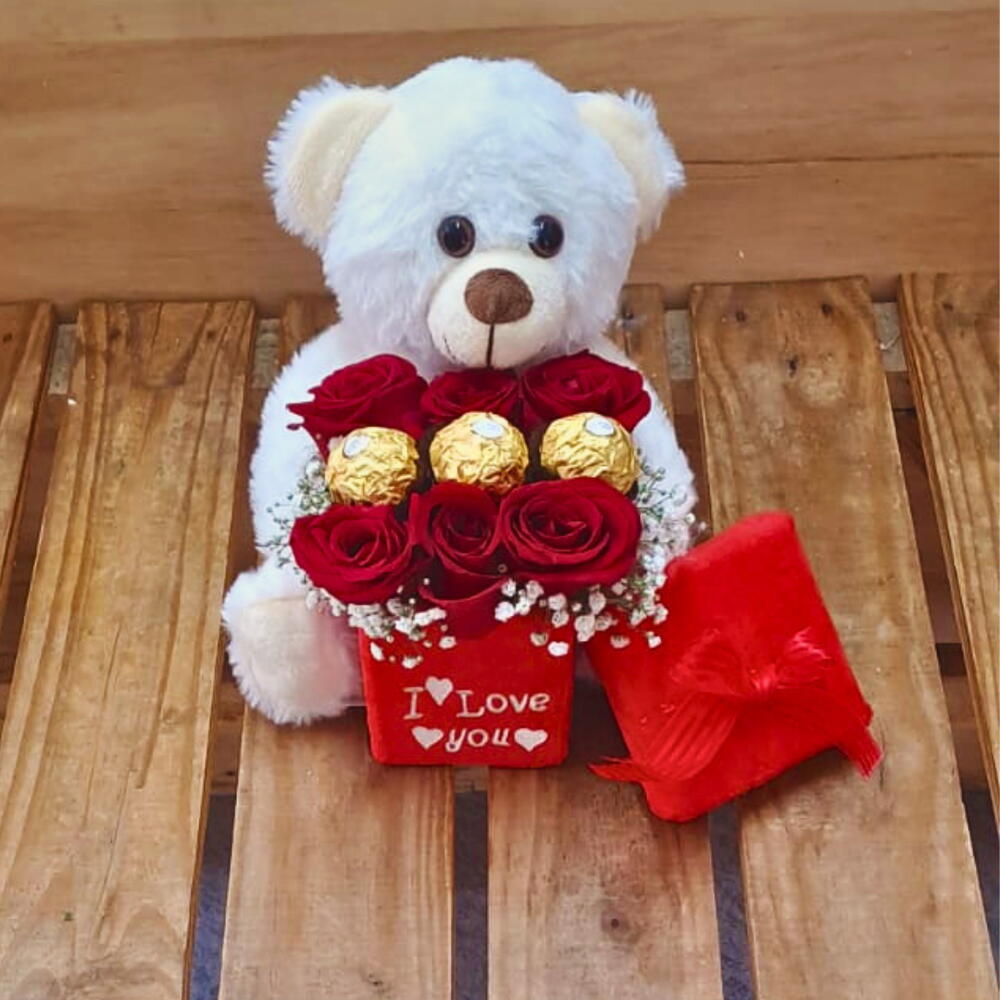 Urso de peluciaTuka Toy 20 cm com flores e chocolates