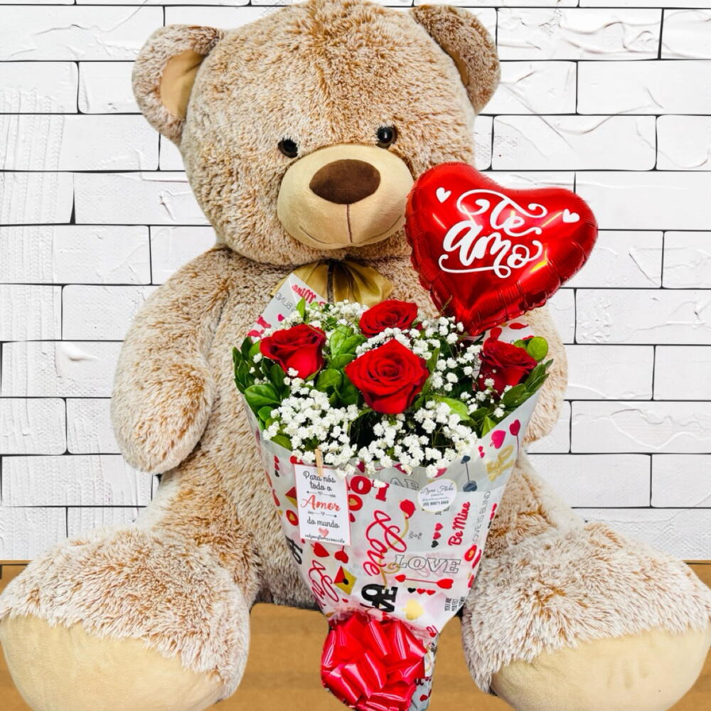 Urso Pelucia Gigante com Buquê de Rosas e Balão Personalizado