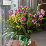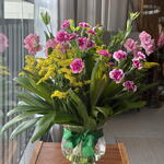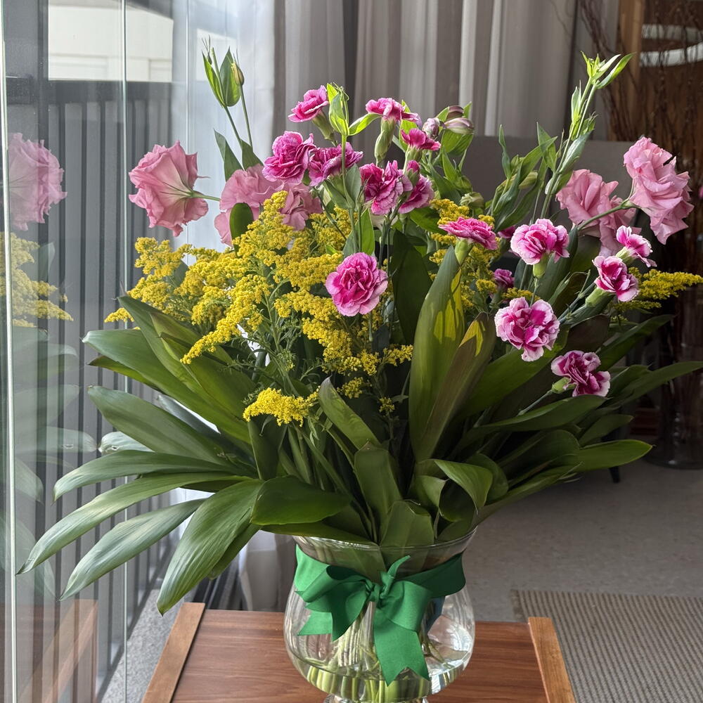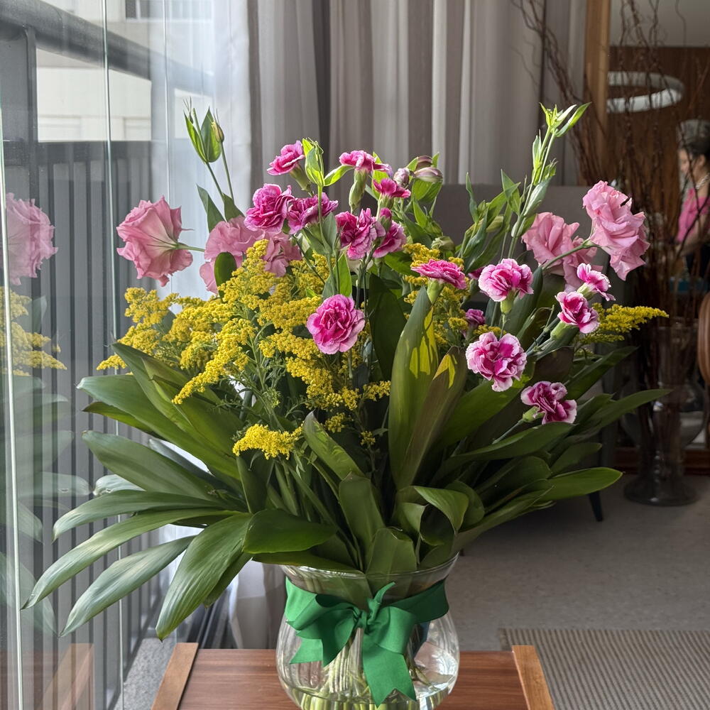 folhagens - 1 un. vaso de vidro - 1 un. astroméria - 1 un. minis rosa variadas - 1 un. cravo lisianto - 1 un.