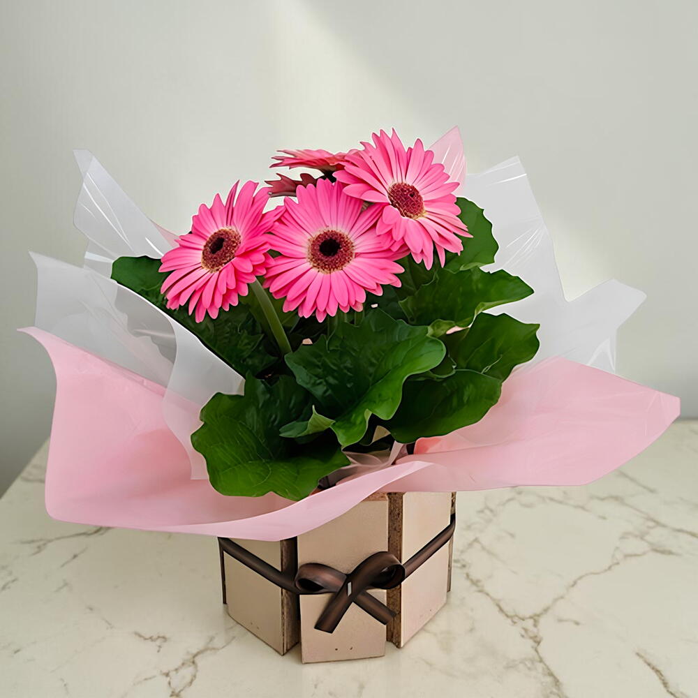 Encantadora composición de gerberas en tonos rosa vibrante, acompañadas de follaje verde intenso y presentada en una elegante caja decorativa con envoltura suave. Ideal para transmitir alegría, cariño y energía positiva.