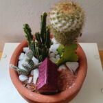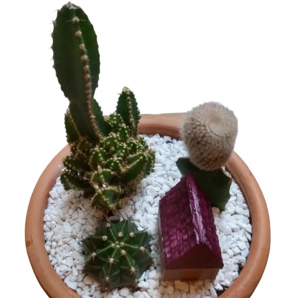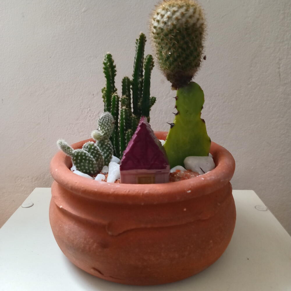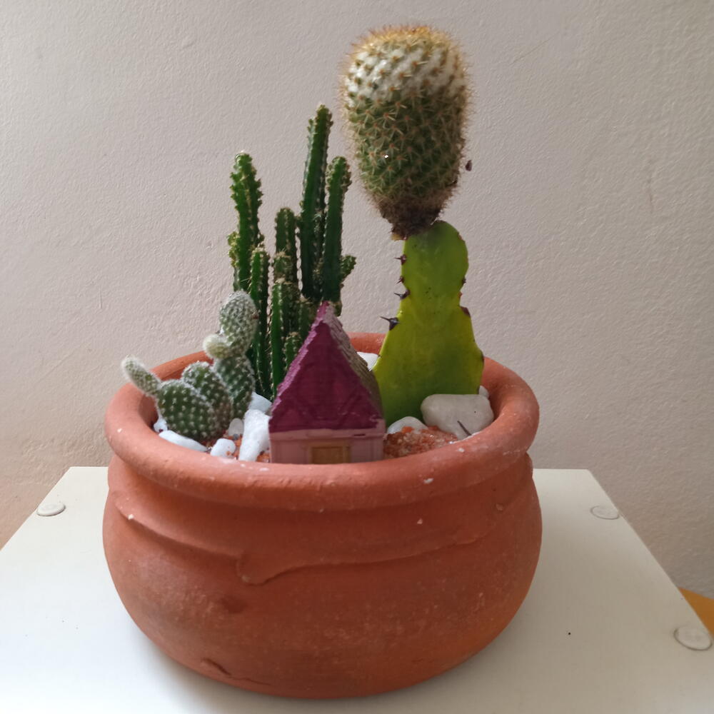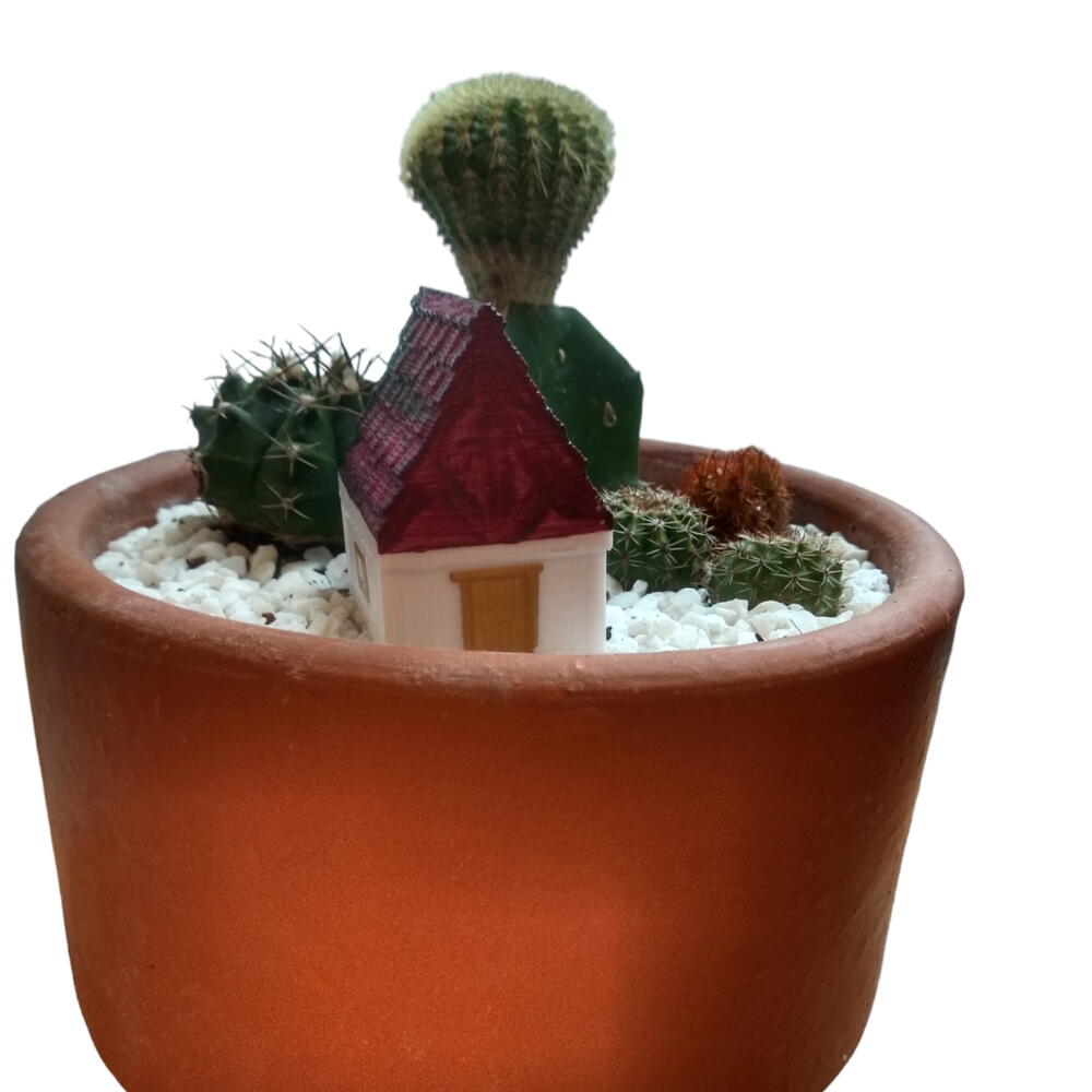 Mini jardim em vaso redondo de barro, composto por: cactos e casinha de plástico com aproximadamente 4,5 cm (L) x 3,3 cm (C) x 5,3 cm (A).