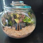 Iluminação Mantenha seu terrário em local iluminado, com luz indireta, pode ser natural ou não (sem luz, não há fotossíntese). O Sol em contato com o vidro, pode literalmente cozinhar suas plantinhas, então não deixe seu terrário onde bata Sol ou seja, muito quente. Água Fique atento com as gotinhas d'água no vidro. Se houver, seu terrário está saudável. Se houverem gotinhas demais, que não diminuem no decorrer do dia, abra o vidro por algumas horas (umidade demais, pode deixar os musgos marrons e apodrecer as folhagens). O ambiente interno do terrário, é quente e úmido, por isso, em dias muito frios ou sob o ar-condicionado, é normal que seu terrário transpire mais. Se não houver gotinhas no vidro, se perceber a terra mais clara, borrife um pouco de água filtrada pela parede do vidro ou diretamente na terra, só um pouco, não é para encharcar a terra (use o borrifador ou pipeta fornecidos juntamente com seu terrário). Depois, feche-o novamente. No caso dos mini-terrários, você pode usar até mesmo uma pequena seringa. Em terrários que contenham somente musgos, você poderá pulverizar a água diretamente sobre eles, mas no caso de folhagens, molhe sempre pelo vidro ou pela terra. A água acumulada sobre as folhas, pode apodrecê-las. Recipiente com tampa de vidro, pode precisar ser molhado a cada 1 ou 2 meses. Já recipiente com tampa de cortiça, normalmente a cada 3 ou 4 meses. Mas atenção ! O tempo de rega poderá variar muito de acordo com seu tamanho, tipo de vidro, tipo de plantas, local onde ele fica, etc. Então é muito importante que você SEMPRE observe como está o seu terrário ! Manutenção De vez em quando, abra o terrário, limpe o vidro e a tampa com um papel toalha ligeiramente umedecido em álcool. Retire as folhas velhas caídas no solo. A decomposição das mesmas pode gerar o crescimento de fungos. Caso apareçam fungos no vidro, faça a limpeza com papel toalha e álcool, caso fungos apareçam na planta, remova a parte afetada com uma tesourinha desinfetada em álcool. Quando sua plantinha for crescendo, desinfete uma tesourinha e delicadamente faça uma pequena poda, assim você manterá a harmonia e beleza do seu terrário. Atenção ! Não esqueça de periodicamente observar seu terrário, verificar se tudo está indo bem e como está o seu desenvolvimento. Tendo esses cuidados, seu terrário poderá durar anos !