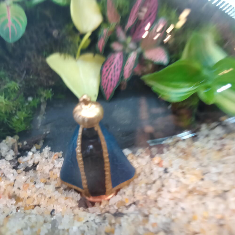 Terrários são recipientes fechados onde são cultivadas plantas específicas, que nas condições adequadas, produzem um micro ecossistema no qual o ciclo da água é muito bem definido. A água é absorvida pelas raízes das plantas e é eliminada pelas folhas por evaporação. Como o espaço não é suficiente para absorver todo o vapor que se fixa nas paredes do vidro, ocorre uma espécie de chuva (condensação) e a água retorna pelo solo. Terrario em vaso de vidro redondo com tampa de vidro, com imagem em resina da Nossa Senhora Aparecida. Com pedras, musgos, fitonias.