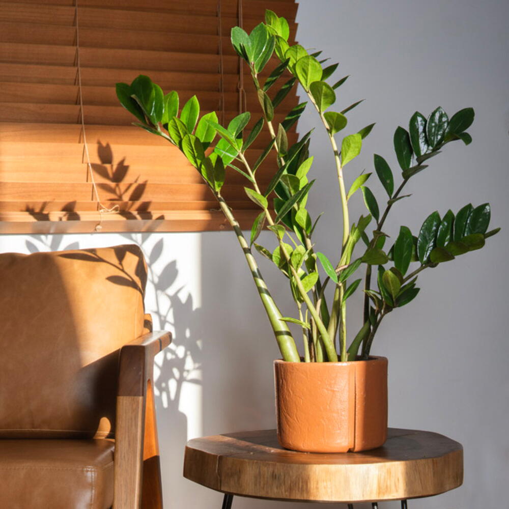 A Zamioculca é uma espécie originária da África Ocidental e é excelente para a decoração de interiores por não precisar de luz direta. A planta, que possui múltiplas folhas verdes brilhantes, é conhecida por trazer prosperidade a aqueles que cuidam dela é muito usada para feng shui.