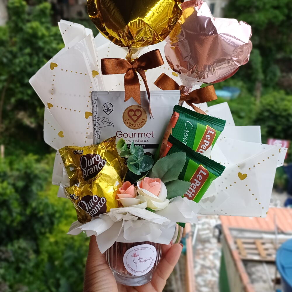 Apresentamos um conjunto requintado perfeito para os amantes do café. Este conjunto inclui uma xícara de vidro resistente e um elegante drip coffee, ambos essenciais para preparar uma xícara de café perfeita. Acrescentamos um toque doce ao conjunto com dois bombons variados e dois saches de biscoitos, perfeitos para desfrutar ao lado do seu café. Tudo isso é cuidadosamente arrumado em uma cesta com um belo arranjo de flores, tornando-o a opção de presente ideal. Não perca a oportunidade de encantar alguém com este conjunto versátil e delicioso.